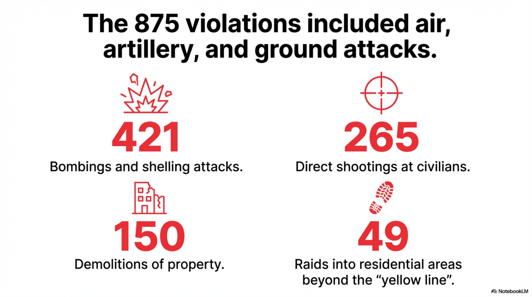 49 raids into residential areas, often beyond the designated "Yellow Line" – a supposed boundary for withdrawal.